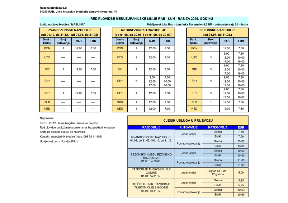 Linie Rab (Hafen Rab) - Lun (Hafen Tovarnele - Insel